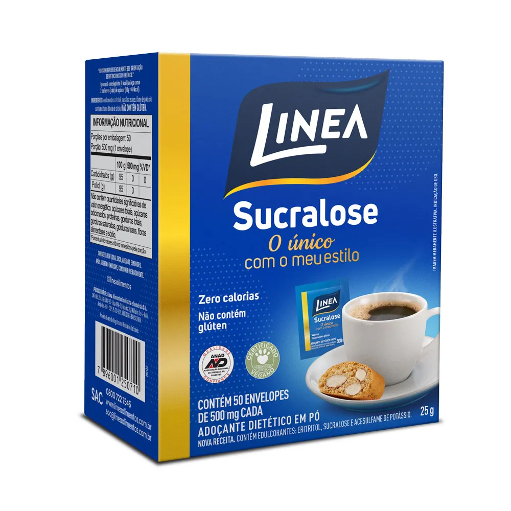 Adoçante em Pó Sucralose Línea 50un: A sucralose é derivada da cana de açúcar e possui sabor muito semelhante ao açúcar original, sem deixar o amargor residual dos adoçantes tradicionais. Ideal para adoçar sucos e o cafezinho.