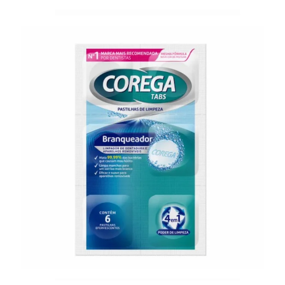 Corega Tabs Branqueador 6 pastilhas Corega Tabs Branqueador são pastilhas de limpeza que deixam sua prótese ou aparelho removível mais limpo, brilhante e refrescante em apenas 3 minutos, matando até 99,99% das bactérias causadoras do mau hálito e garantindo uma limpeza profunda ao remover mesmo as manchas mais difíceis. Benefícios e diferenciais das pastilhas Corega Tabs Pastilhas efervescentes para limpeza de próteses e aparelhos removíveis. Deixam a prótese ou aparelho removível mais limpo, brilhante e refrescante. Resultados em apenas 3 minutos. Mata até 99,99% das bactérias causadoras do mau hálito. Limpeza profunda que ajuda a remover mesmo as manchas mais difíceis. Embalagem com 6 unidades. Uso: Coloque 1 pastilha de COREGA TABS Branqueador em um copo contendo água morna (não quente) suficiente para cobrir a prótese dentária ou aparelho removível. Para melhores resultados, assegure-se de que a prótese ou aparelho estejam totalmente imersos na solução. Deixe a prótese dentária ou aparelho removível de molho na solução durante 15 minutos e, para melhores resultados, escove-o com a própria solução, com uma escova macia. Em seguida, enxágue bem a prótese dentária ou aparelho removível em água corrente e descarte a solução de Corega Tabs Branqueador imediatamente. Advertências Não use se você é sensível a quaisquer dos ingredientes. Lave bem as mãos após manusear a pastilha ou a solução. Após o uso do produto, enxágue bem a prótese dentária ou aparelho removível. Pode ocorrer reação alérgica. Se ocorrer irritação, descontinue o uso e procure orientação do profissional de saúde. Se entrar em contato com os olhos causa séria irritação, neste caso lavar cuidadosamente com água por alguns minutos, se a irritação nos olhos persistir procure orientação médica. Não coloque as pastilhas e/ou a solução na boca. Não use se você é sensível a quaisquer dos ingredientes da fórmula. Não beba a solução e não utilize como enxaguatório bucal