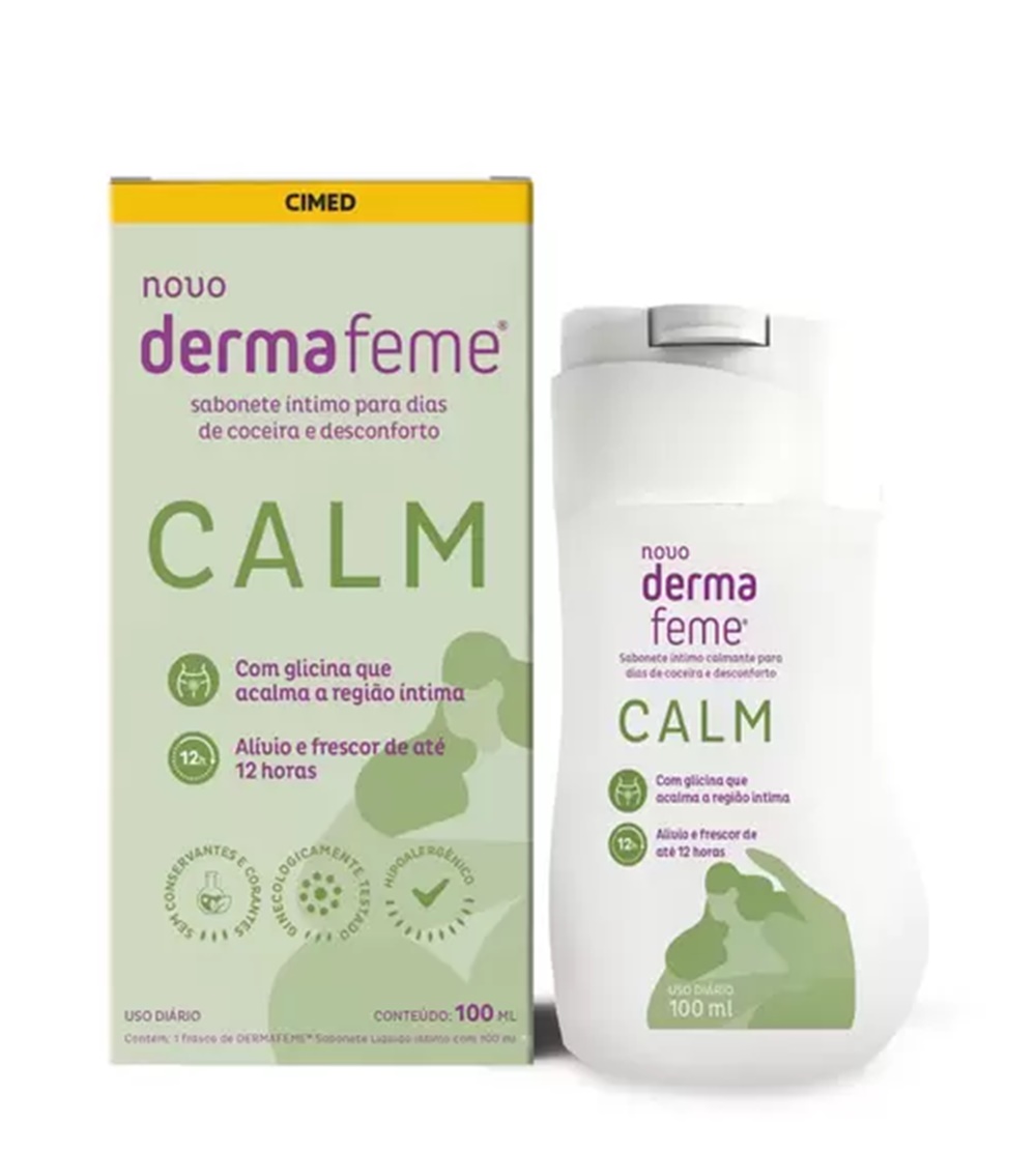 Dermafeme Calm é um sabonete líquido íntimo de uso diário e que foi desenvolvido para aliviar os sintomas de coceira e incômodo na região íntima, graças à ação da glicina, ingrediente que atua no tratamento dos desconfortos vaginais. Proporciona diariamente uma agradável sensação de alívio e frescor por até 12h. Produto ginecologicamente testado, hipoalergênico, livre de conservantes e corantes. Uso indicado a partir dos 12 anos.