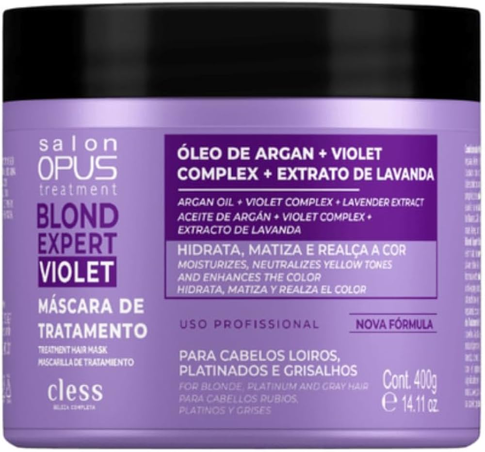 A Máscara de Tratamento Salon Opus Blond Expert Violet trata, hidrata, repara, define e flexibiliza os fios. Auxilia na eliminação do indesejado tom amarelado causado por oxidação natural, promovendo brilho prateado especial aos cabelos loiros (descoloridos ou com mechas), brancos ou grisalhos. Sua fórmula nutritiva com propriedades antioxidantes aliadas ao pigmento violeta, além da ação antienvelhecimento, auxilia na neutralização do tom amarelado, hidrata os fios deixando-os mais macios e brilhantes. Além de tratados, condicionados e totalmente reparados, seus cabelos ficam mais leves, brilhantes e saudáveis.