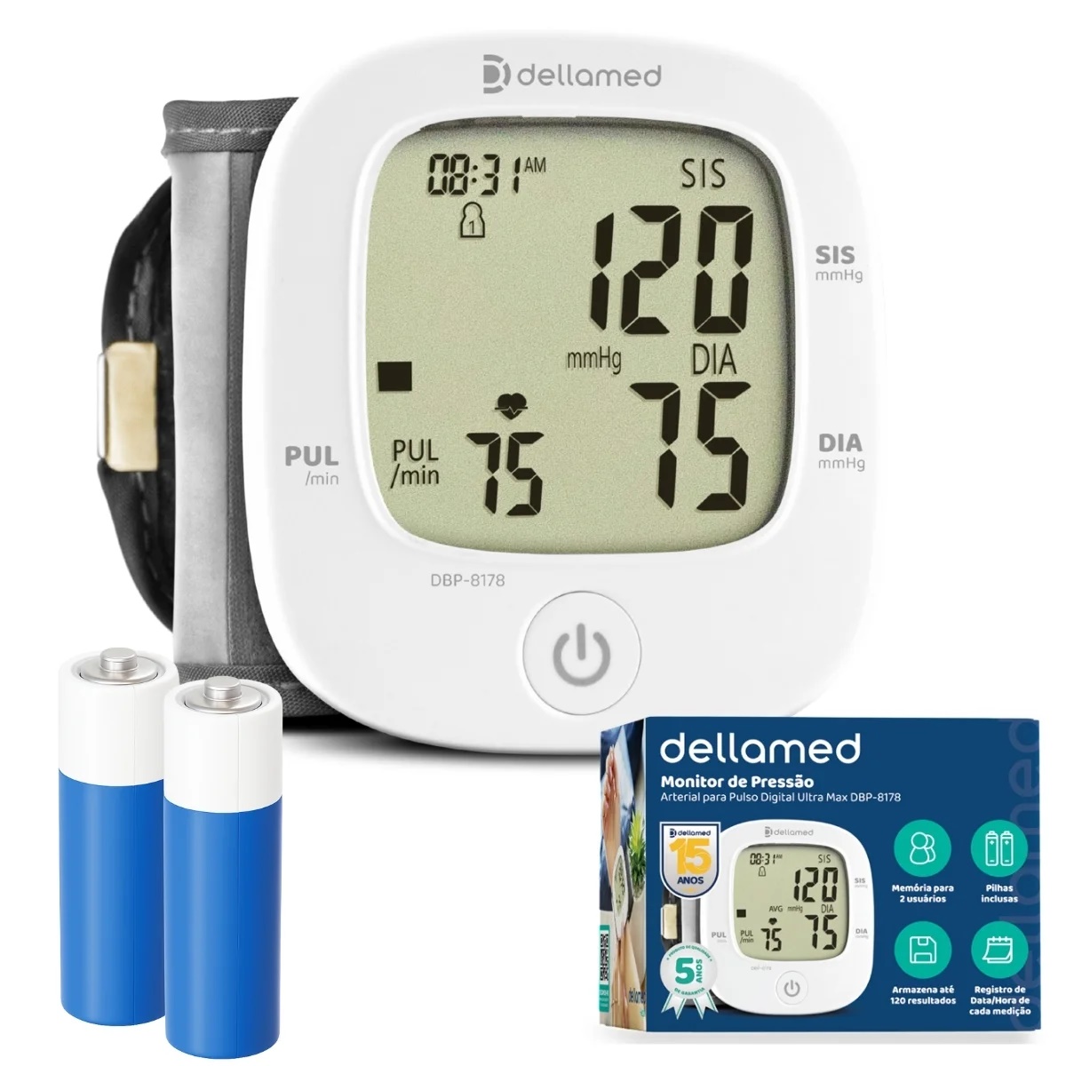 MONITOR PRESSAO PULSO DELLAMED O AUTOMATICO ULTRA DBP-8178 O Dellamed Ultra DBP-8178 é um monitor de pressão arterial automático para o pulso que mede a pressão, pulsação e detecta arritmias. Ele é fácil de usar em casa, com recursos como indicador de erro de movimento, braçadeira ajustável, armazenamento de leituras e desligamento automático. Algumas versões podem ter funcionalidade de voz, mas é importante verificar as especificações do modelo exato. Monitor automático de pulso 3 em 1: mede pressão arterial, pulsação e detecta batimentos irregulares. Traz memória para 2 usuários (60 resultados cada), operação simples e leituras rápidas para o acompanhamento diário. Memória: 60 × 2 usuários Braçadeira de pulso 12,5–20 cm 5 anos de garantia