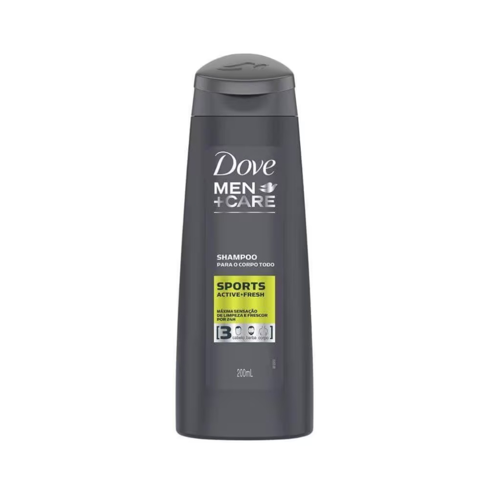 DESCRIÇÃO:Shampoo 3 em 1 Sports Dove Men Care foi especialmente desenvolvido para uma limpeza e cuidado para o cabelo, barba e corpo em um único problema, para homens que buscam limpeza profunda e refrescante. Indicado para todos os tipos de cabelo.AÇÃO/ATIVOS:Sua fórmula é enriquecida com ativos que promovem limpeza e cuidado, fortalecendo a fibra capilar, deixando o cabelo visivelmente saudável e resistente à quebra. Oferece máxima sensação de refrescância com fragrância fresca e duradoura, por 24 horas. Imagem meramente ilustrativa. O produto pode ter variação de cor ou desenho, porém as características gerais são as mesmas especificadas na descrição do produto.MODO DE USAR:Aplique o shampoo no corpo, cabelos e pelos molhados, em seguida enxágue. Repita o processo se necessário.ESTE KIT CONTÉM: 01 UNIDADE DE DOVE MEN CARE SPORT ACTIVE SHAMPOO P/ TODO O CORPO 200MLDove Men Care Sport Active Shampoo P/ Todo o Corpo 200ml