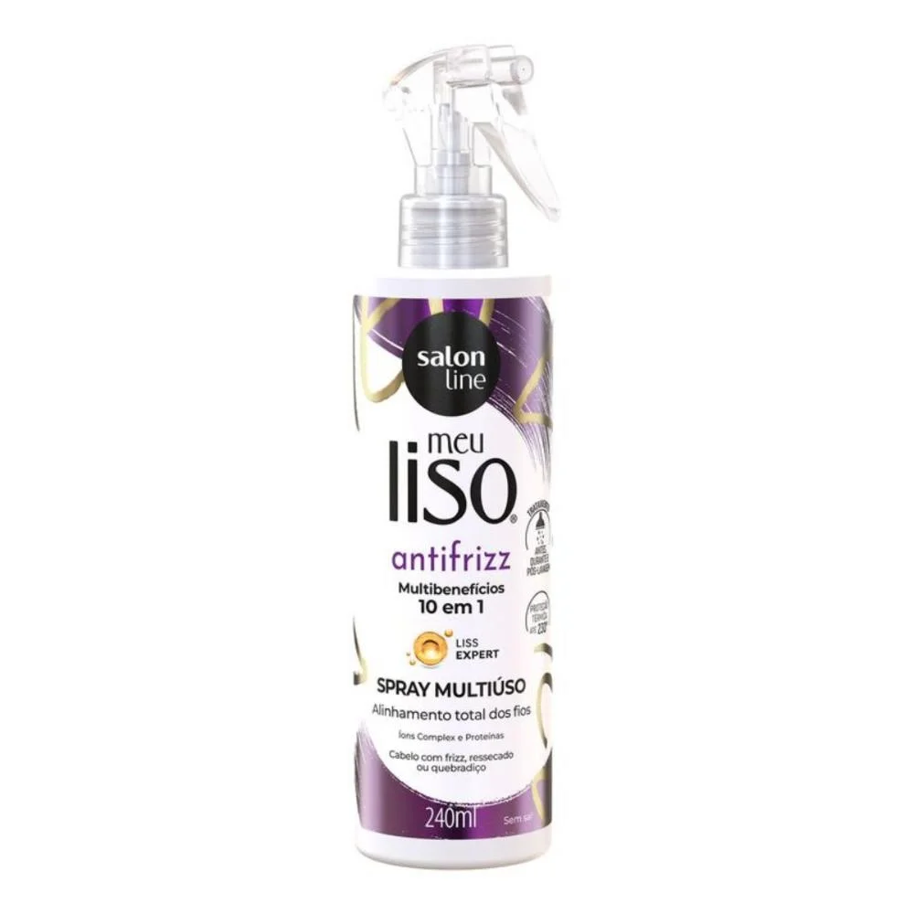 O Spray Multiuso Meu Liso Antifrizz é um superproduto que pode ser usado de três maneiras diferentes e contém 10 benefícios em 1 spray. É para quem deseja fios totalmente alinhados, hidrata intensamente, controla o frizz, sela as cutículas, da brilho e maciez sem pesar.