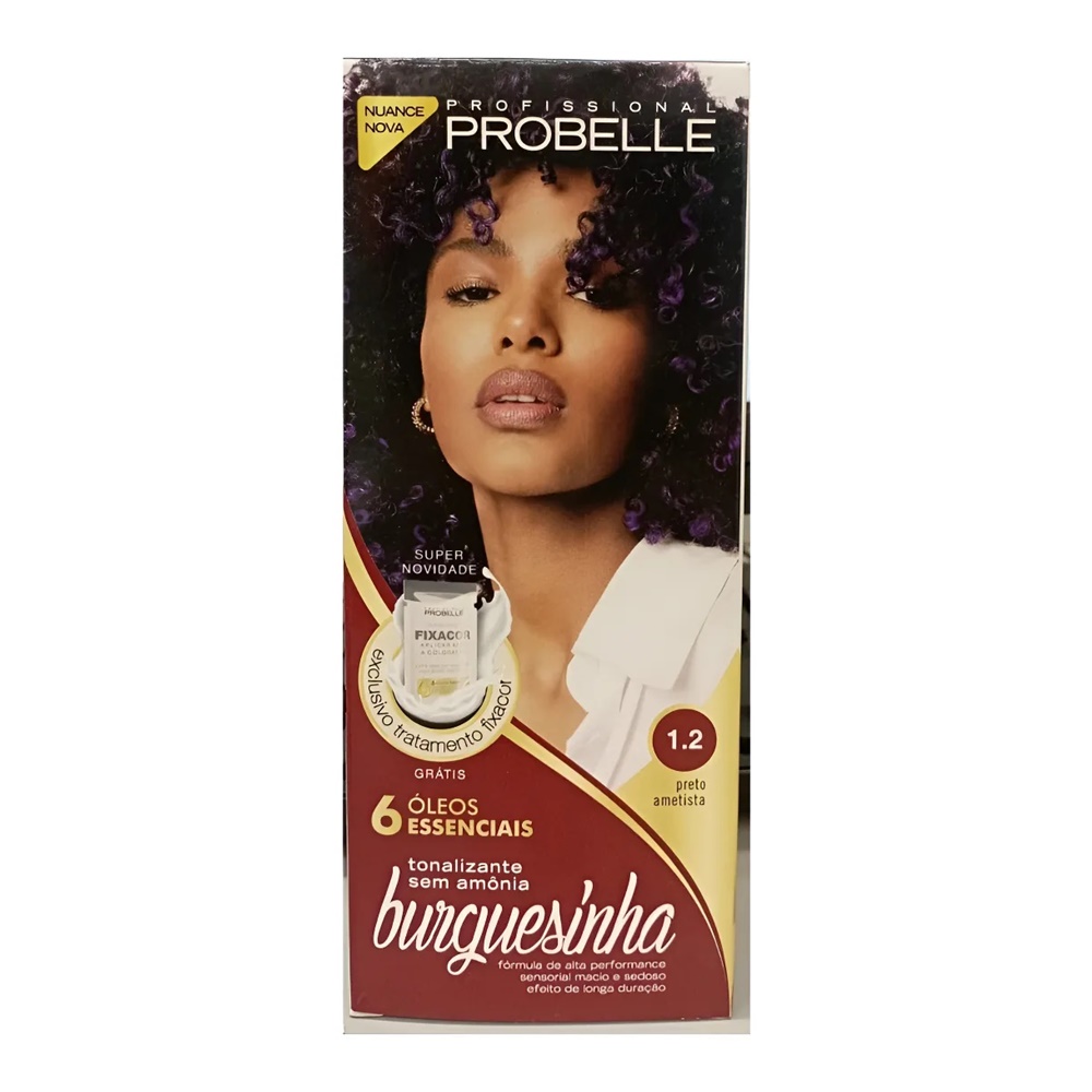 A Tintura Probelle Burguesinha 1.2 Preto Ametista é uma coloração sem amônia que oferece um preto profundo com reflexos sutis de ametista, tratando os fios durante o processo