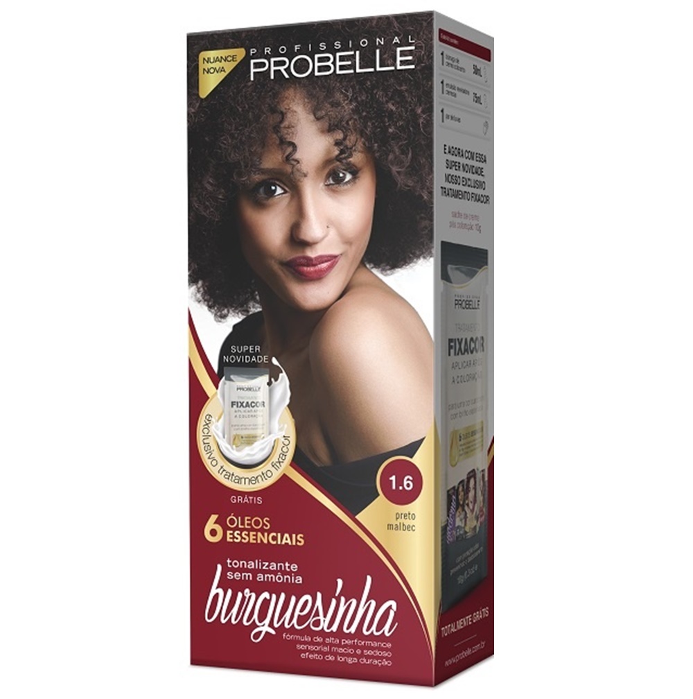 A Tintura Probelle Burguesinha 1.6 Preto é um tonalizante sem amônia que oferece uma cor preta profunda com reflexos violetas sutis, além de tratar os fios com uma mistura de 6 óleos essenciais.